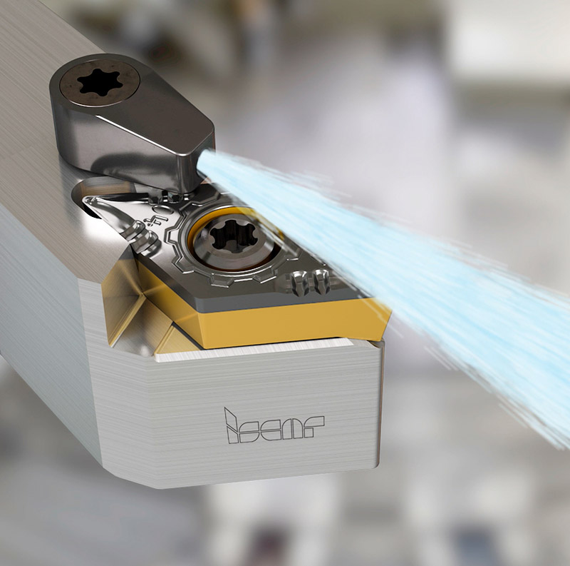 As mentioned, applying high pressure cooling can substantially change machining results especially when deal with titanium, HTSA and difficult-to-cut stainless steel – the main materials for aircraft hydraulic and pneumatic systems and light-sized accessories. The new turning tools with a square shank and a reliable screw clamping mechanism for 55° rhombic insert facilitate HPC in longitudinal, face and profile turning operations on small-diameter parts (Fig. 5).